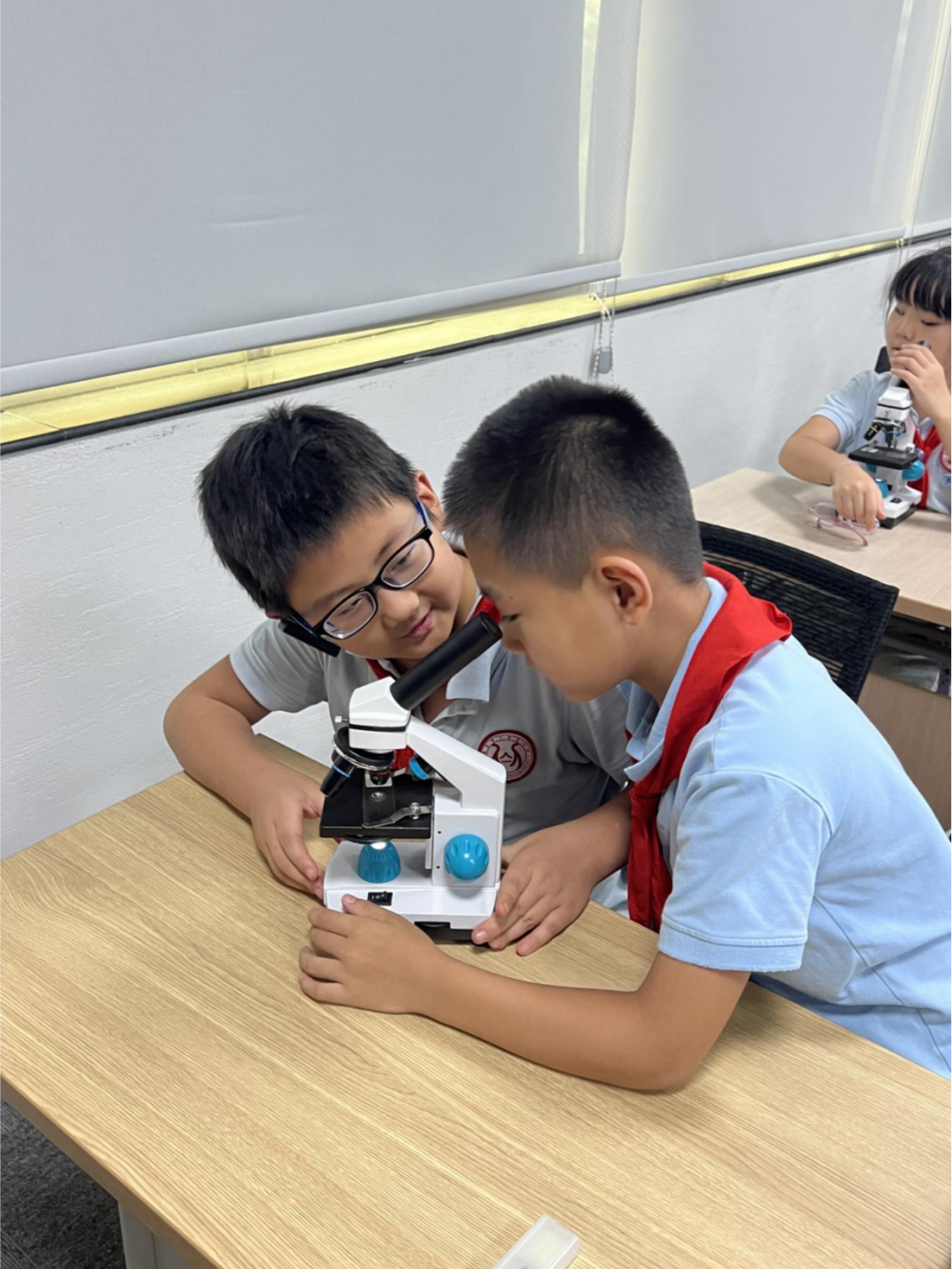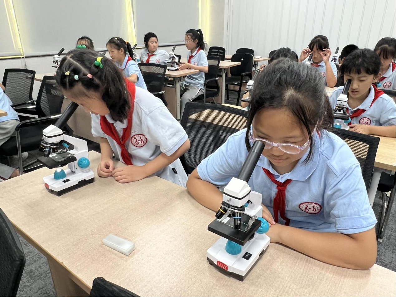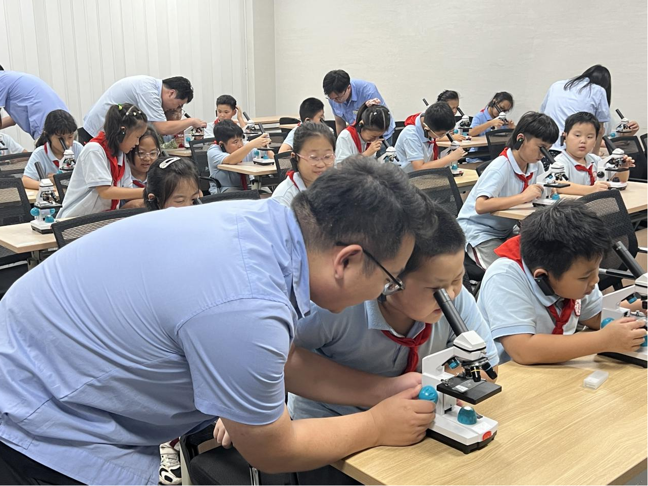在理论基础的铺垫下,最令人激动和期待的实操环节到了!孩子们化身小小光学实验员,分组上阵,亲手操作显微镜观察维生物标本。当曾经熟悉的植物根茎、昆虫触角,甚至是一根头发、一个字母,在显微镜镜头下呈现不同的姿态时,现场顿时响起此起彼伏的惊叹声,同时兴奋地跟他人分享自己的新奇发现,在实践中体验到科学探索的乐趣。